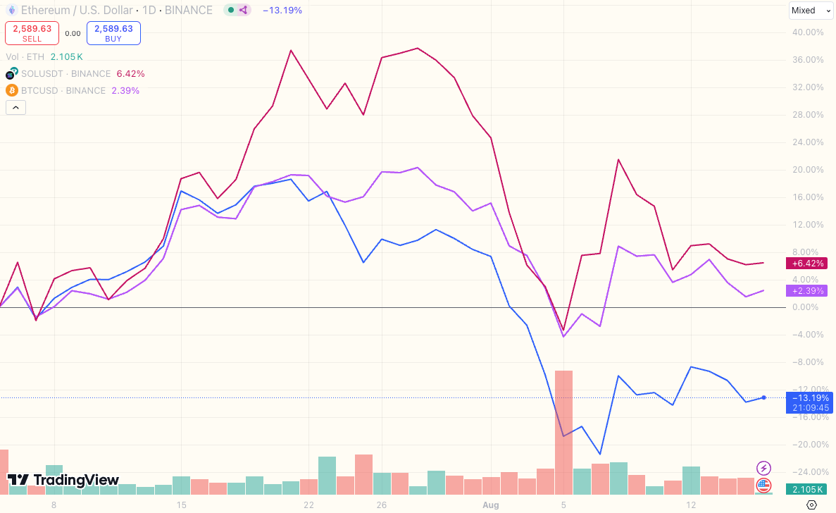 Solana bounced harder but sold off more quickly, Bitcoin held steady in the middle while ETH recovered less quickly but accumulated stronger relative to other majors and far better than its own previous dips.