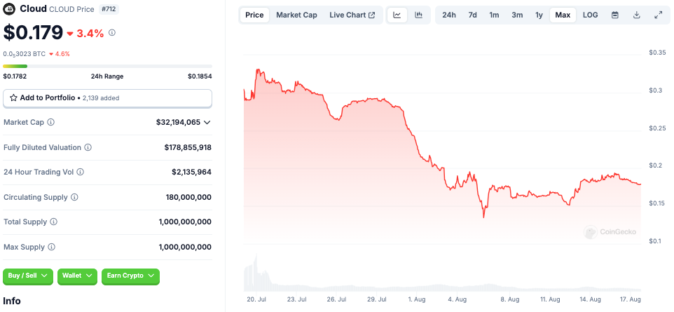 CLOUD launched at a respectable $300M FDV and is currently trading at a very humble $32M market cap.