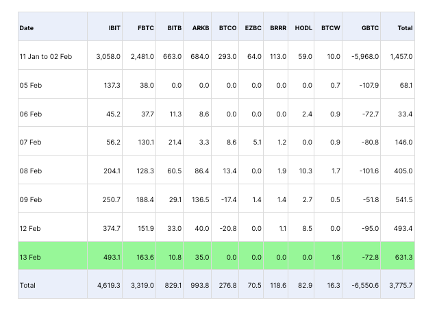 In total, Bitcoin ETFs saw $631 million in inflows on February 12. This is insane. It’s almost insulting how little this statistic is being bandied about across the social media platform formerly known as Twitter.