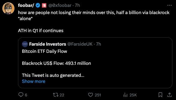 Yesterday alone BlackRock’s IBIT generated fucking $493 million worth of new inflows, which for the innumerate among us is just short of half a billion dollars. That’s half a billion dollars worth of inflows into a single fund, in a single day.