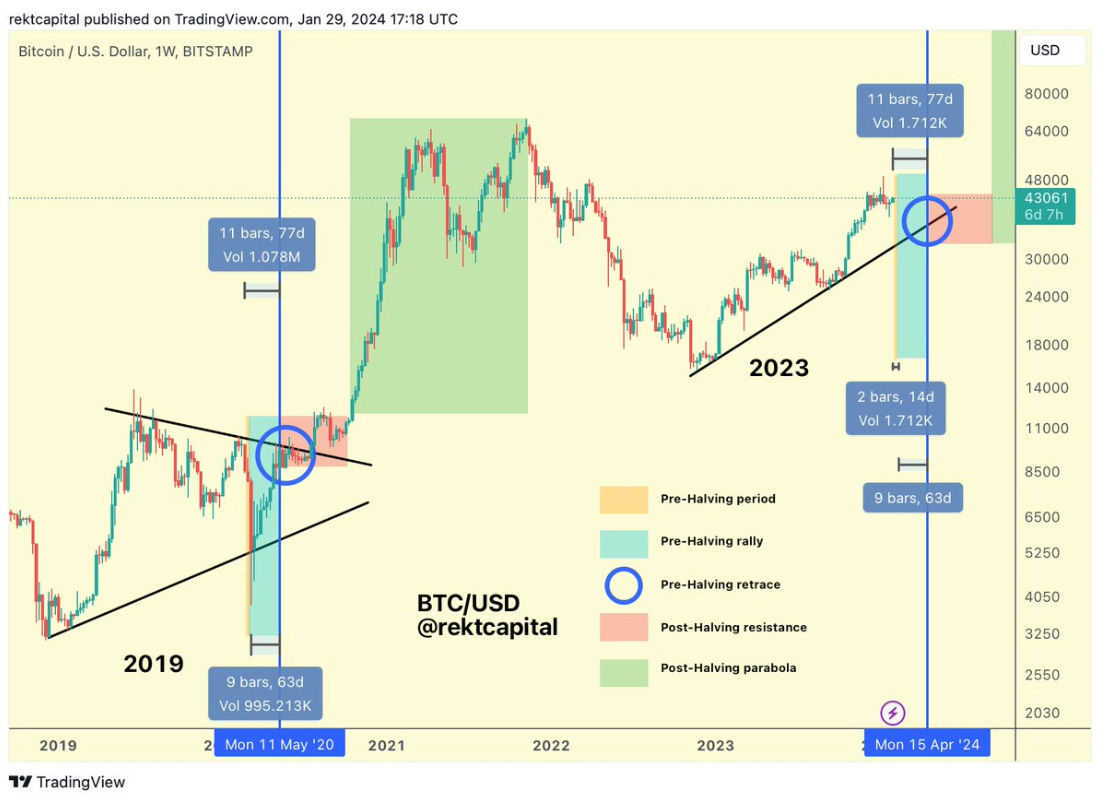 Rekt Capital has a fantastic X thread on BTC’s price action around the halving for those interested.