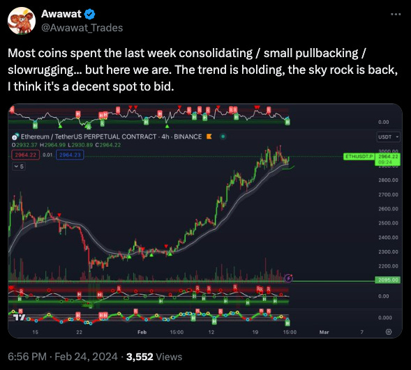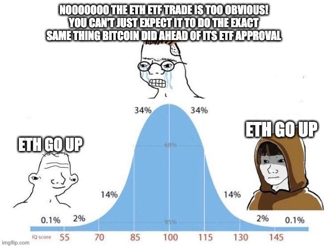 Now that the market is aware of the kind of buying an ETF can bring, it’s very clear ETH will continue a lovely upward grind leading its eventual spot ETF approval, most likely happening sometime in late May but potentially later (due to expected SEC stalling).