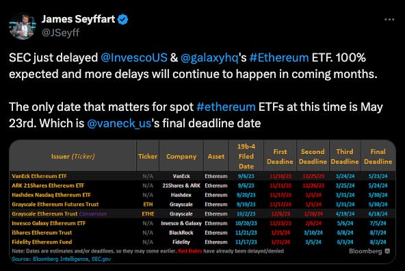 As of right now, there’s no final or clear-cut date for date for an Ethereum ETF, but resident Bloomberg ETF chad James Seyffart believes the “only date that matters” for now is May 23rd; VanEck’s final deadline.