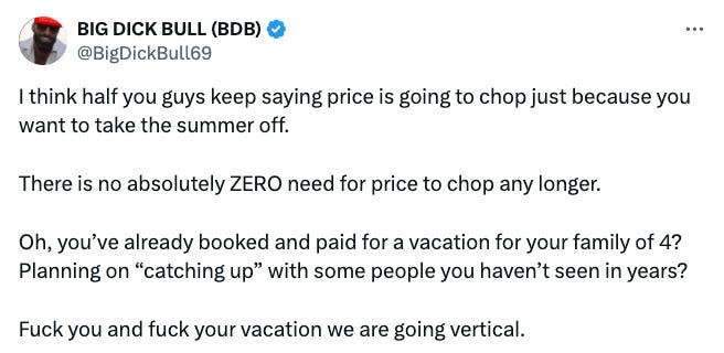 Although I’m torn between a slightly cautious stance and that of perma-bull BDB — who rightly said there’s quite literally zero reason price can’t go vertical immediately.