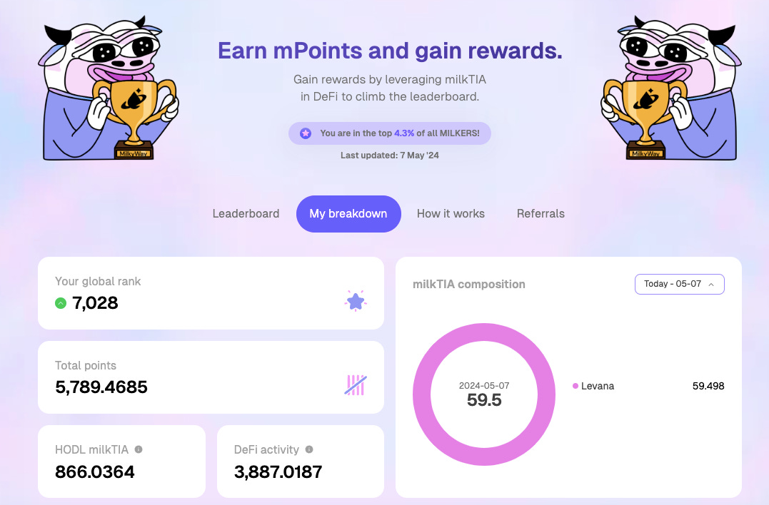 Much like Sanctum, you can earn additional points by taking the new milkTIA liquid staking token and looping into DeFi protocols like Levana or Demex.
